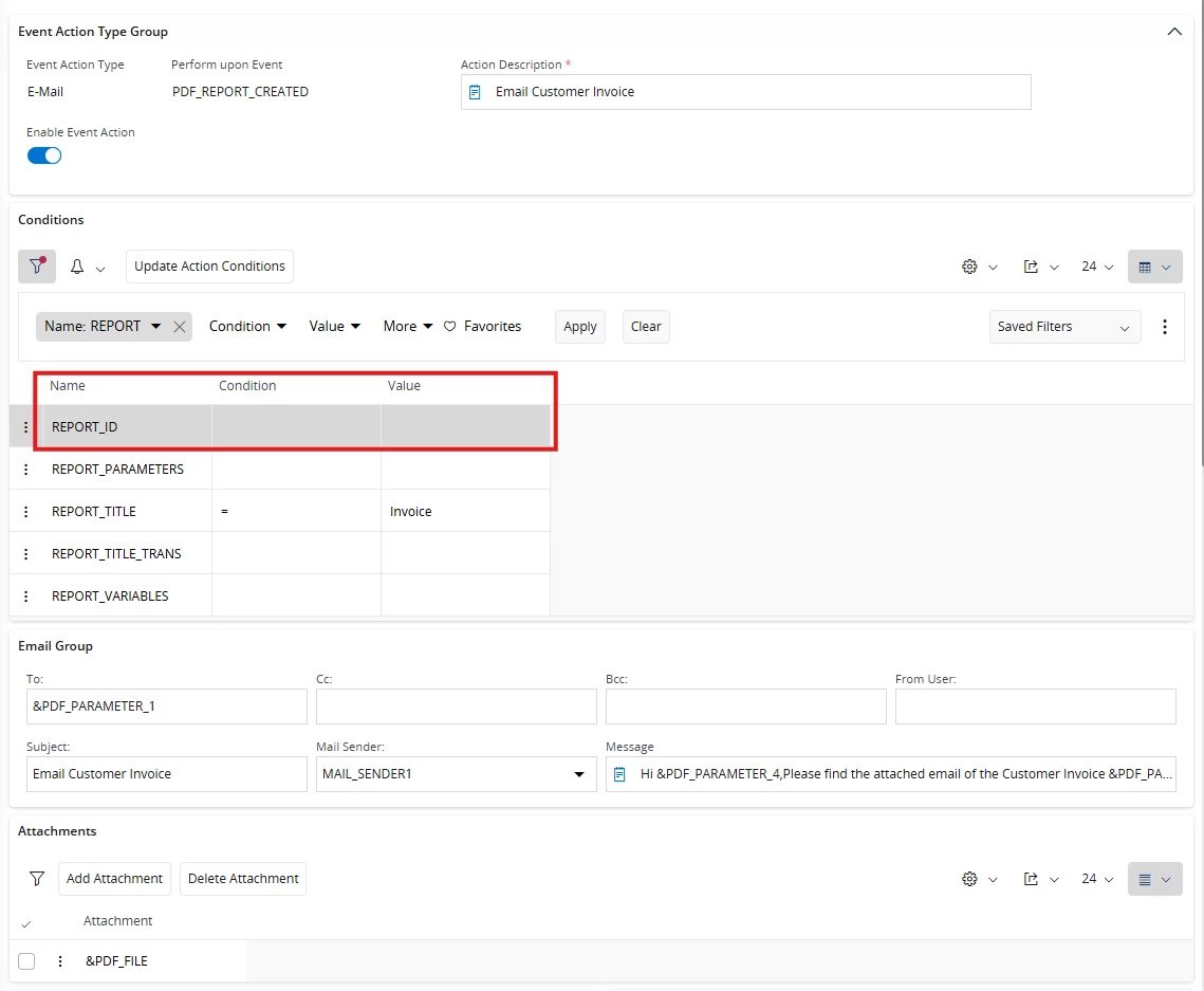 Create a new event action and set REPORT_ID parameter to PROJECT_INVOICE_REP.