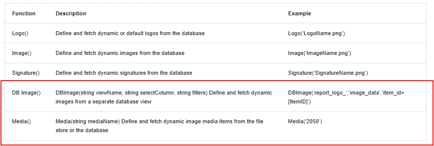 In Report Studio there are five Dynamic Images functions.  Image, Logo, and Signature all work without issue.  I have not been able to get DBImage and Media to work.  Has anybody successfully used these two functions in Report Studio? (I know there are workarounds, I’m specifically asking about the functionality in Report Studio)
