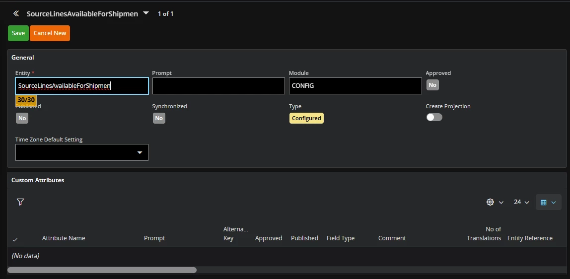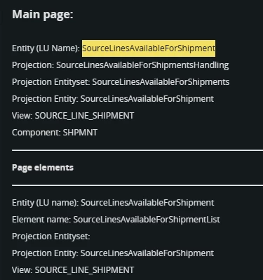 In the Entity Configuration there is no entry for SourceLinesAvailableForShipment. I also found that the name for this Entity is too long. How can this be? Is this a bug in IFS Cloud?