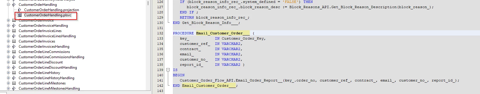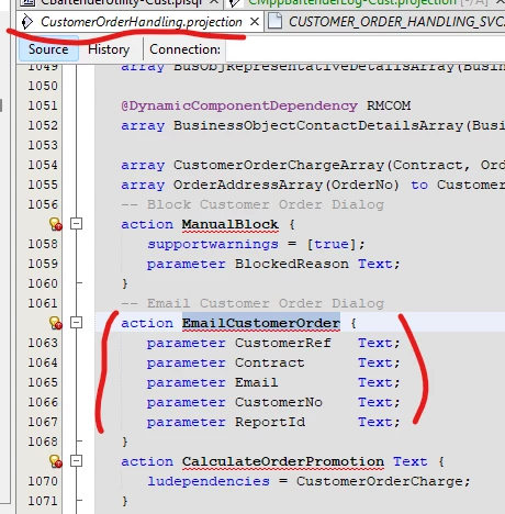 The next place to look now you know the name of the action is in the plsvc file. In CustomerOrderHandling.plsvc it has: