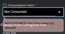 validate [CParAllowNotConsumedDb = "TRUE" or CConsumptionItem != "NotConsumed"] message "NOCONSUMED: Not Consumed not allowed";