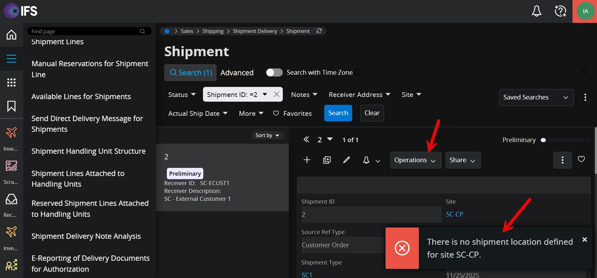 “There is no shipment location defined for site SC-CP.” => IFS24 R2
