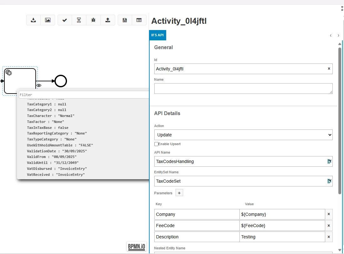 Used the TaxCodesHandling UPDATE API call as IFS API type.