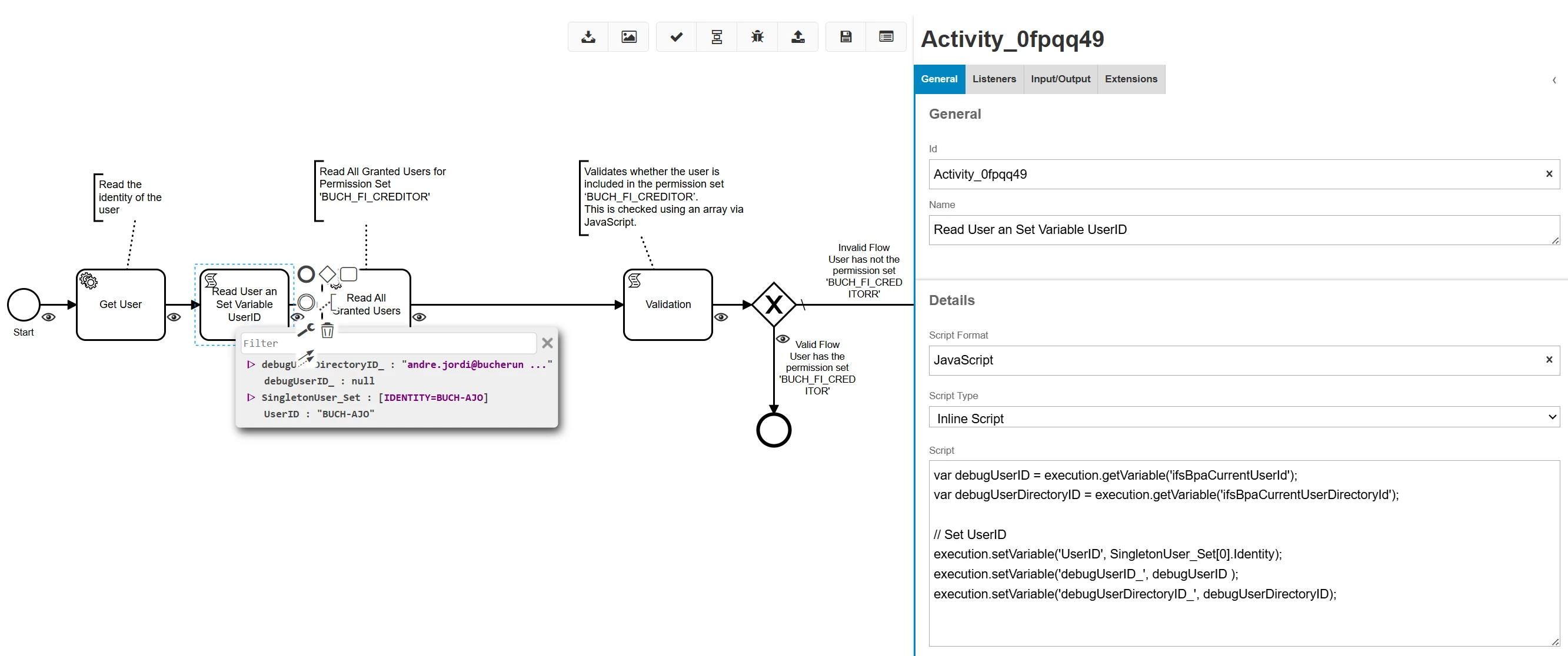 var debugUserID = execution.getVariable('ifsBpaCurrentUserId');