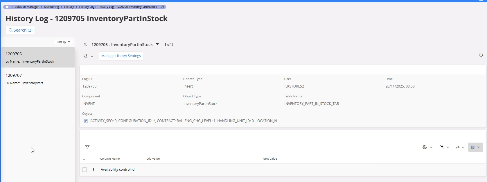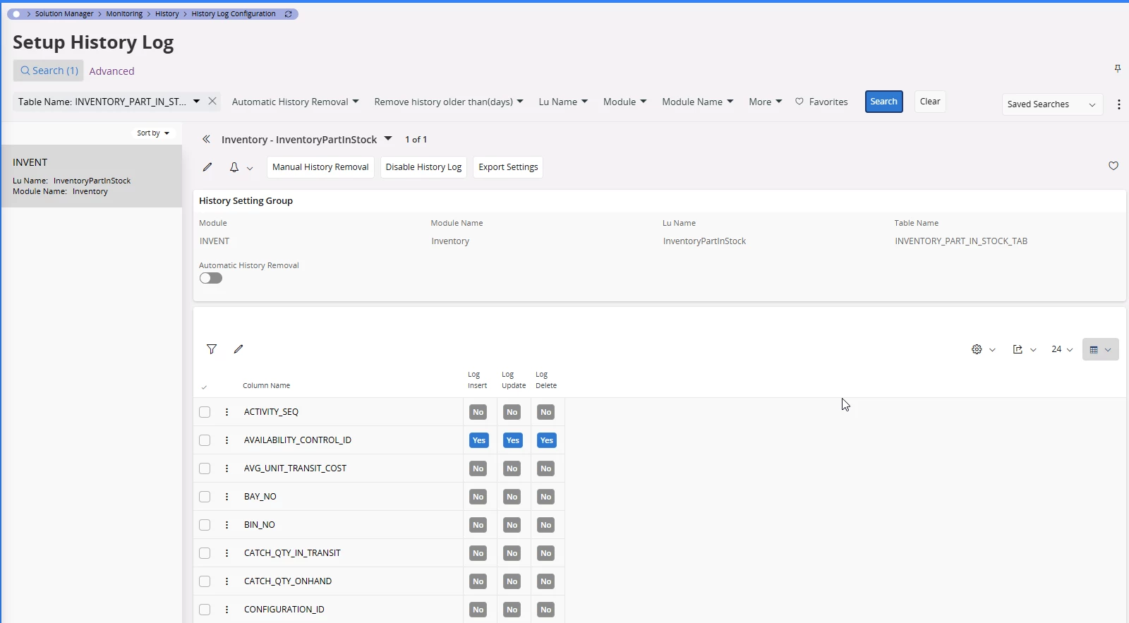 We have set up the following history log on the INVENTORY_PART_IN_STOCK_TAB.