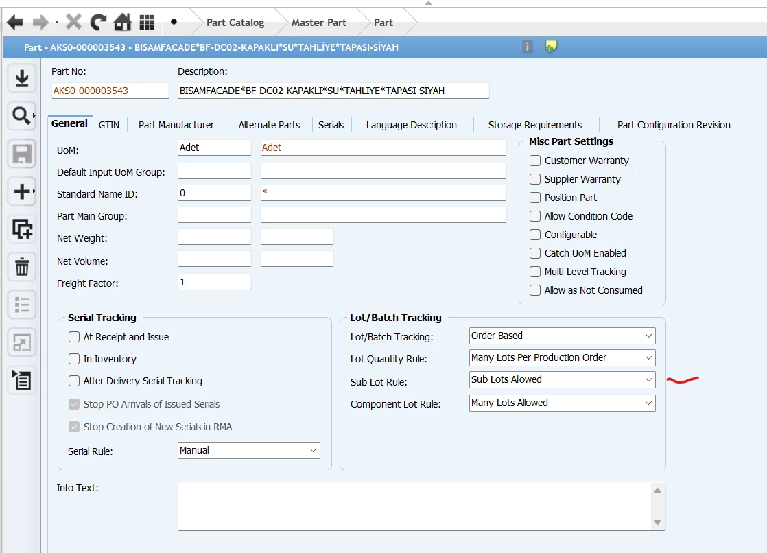 - Child part is lot tracked (Order-Based or Lot Tracking) and is set to Sub Lots Not Allowed. A lot/batch number may or may not be reserved to the child part's order (per normal functionality). If a lot/batch is reserved to the order, it is not a sub lot of the master part's lot.