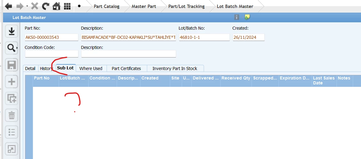 - Child part is not lot tracked. No lot/batch is reserved to the child part's order. It is therefore not a sub lot of the master part's order.