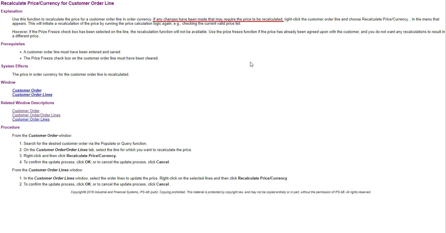 In which situations and how should I use Recalculate Price/Currency menu on the customer order page?