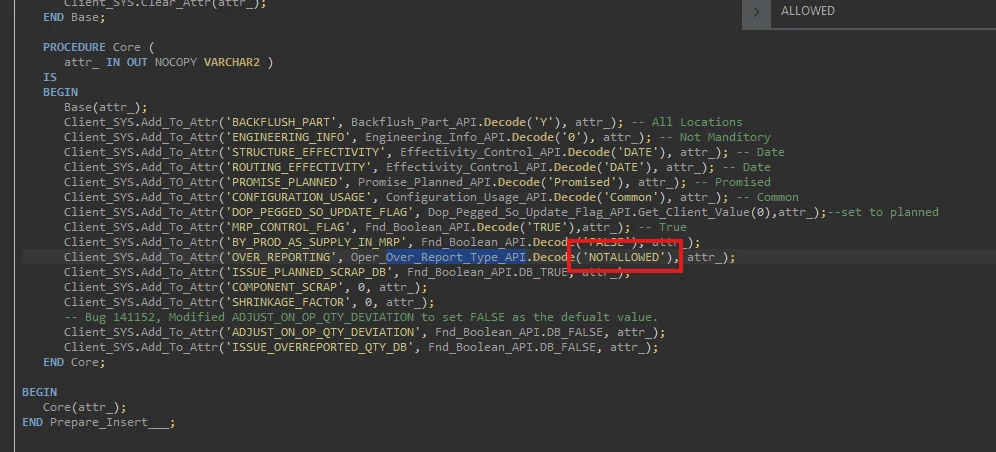 I tried to modify procedure MANUF_PART_ATTRIBUTE_API - the only place that I found with ALLOWED variable, and changed to NOTALLOWED: