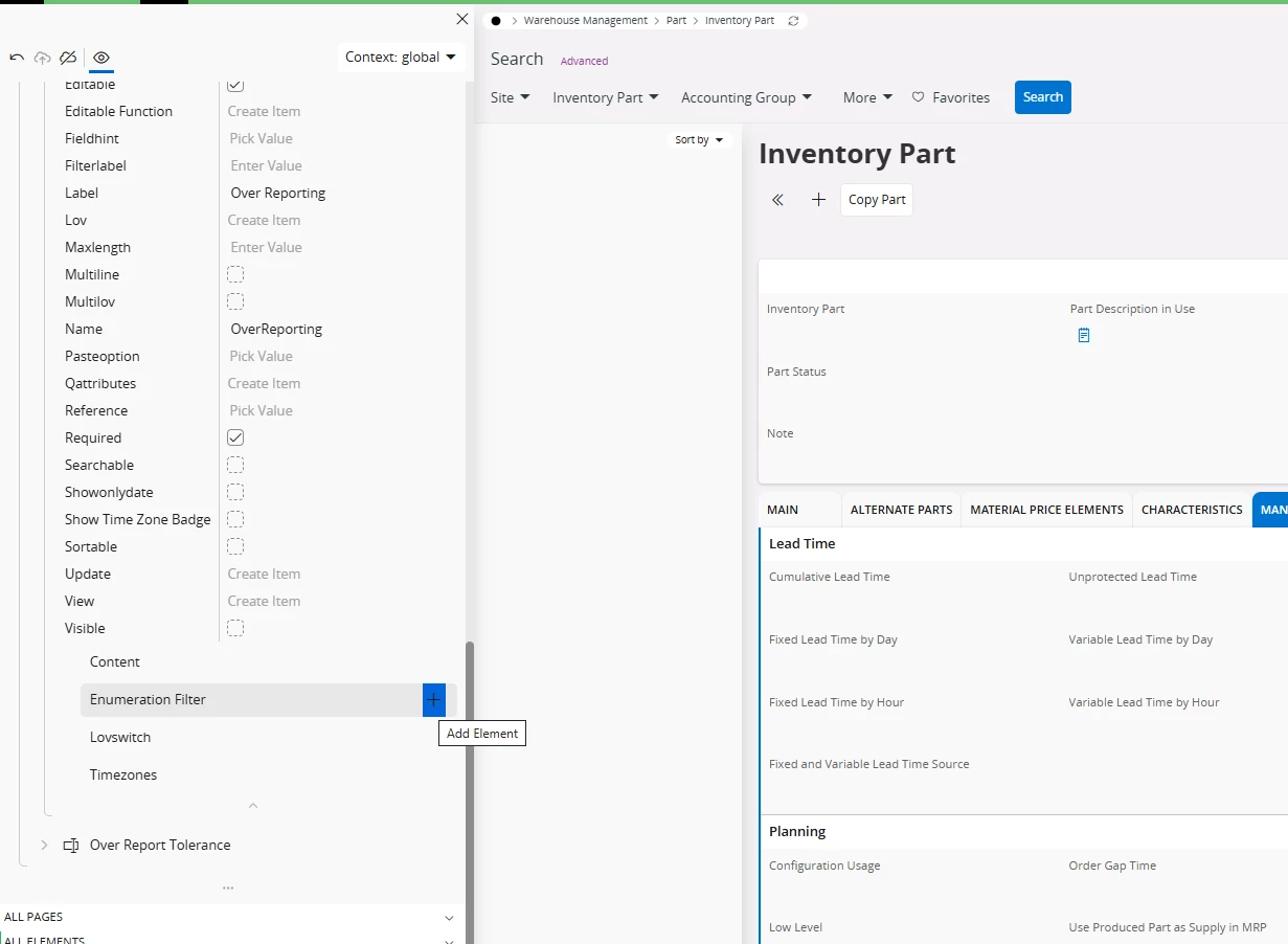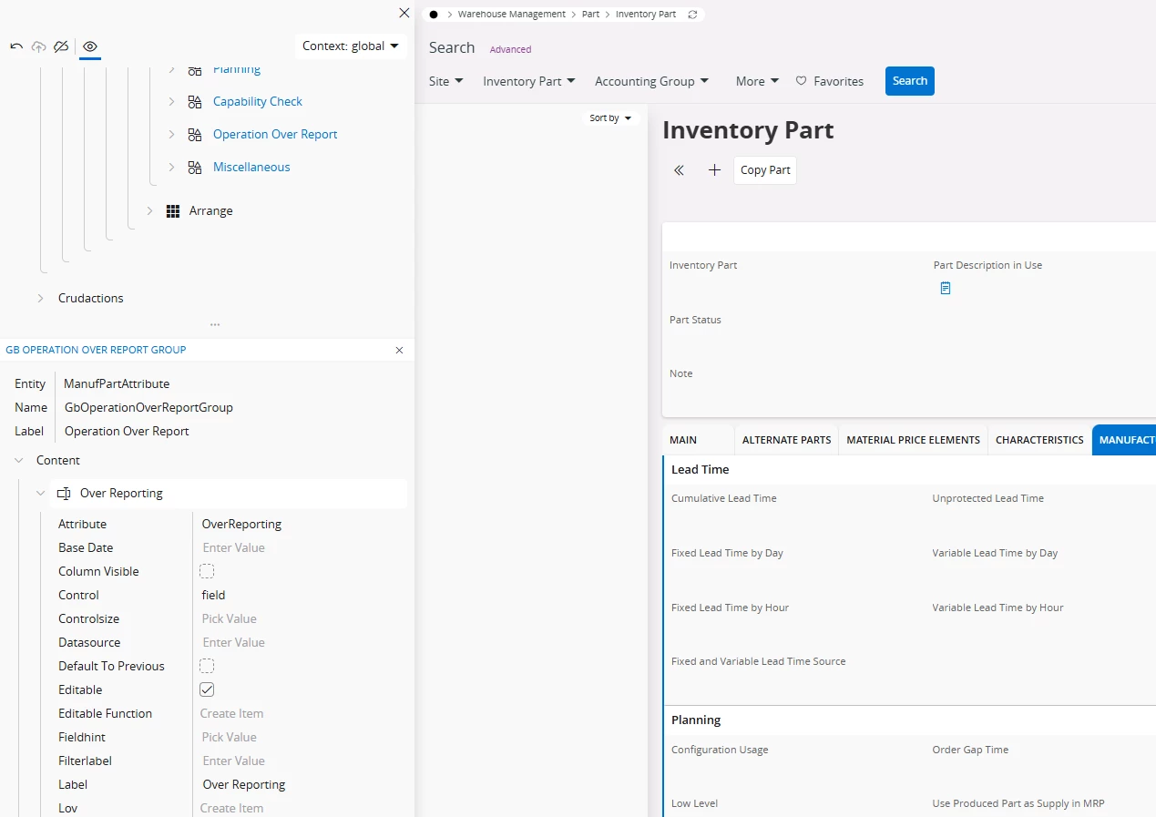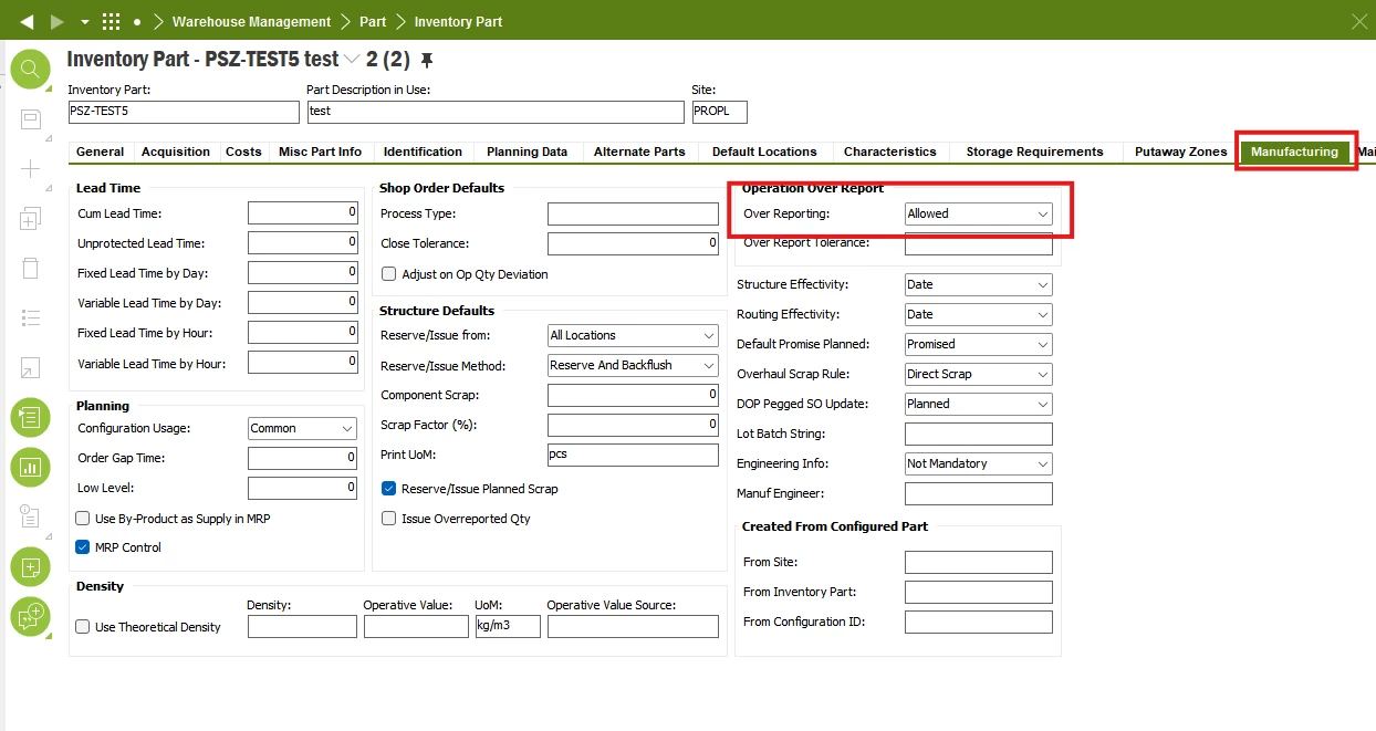 When creating and first saving an Inventory Part at IFS10, the field Over Reporting (manufactoring) is set by default to ALLOWED.