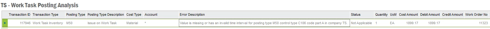 I have encountered an error of “Value is missing or has an invalid time interval for posting type M50 control type C106 code part A in company TS”