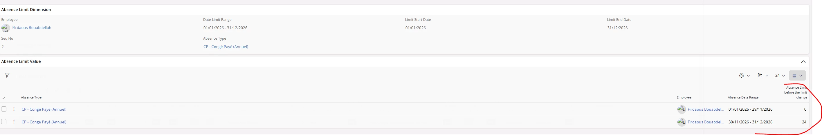 While troubleshooting we tried to compare the data between the employees having problems and the employees for which the acquired limit is displayed correctly and all we could find is that the start date of the employment for the ones who are ok is always first day of the month ( example: 01/12/2024) while for the others is a different date(23/07/2024).