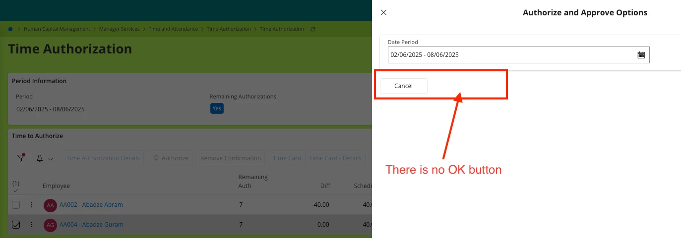 Please help with the following situation: confirmed worked time for employee can’t be authorised since there is no OK button (attached).