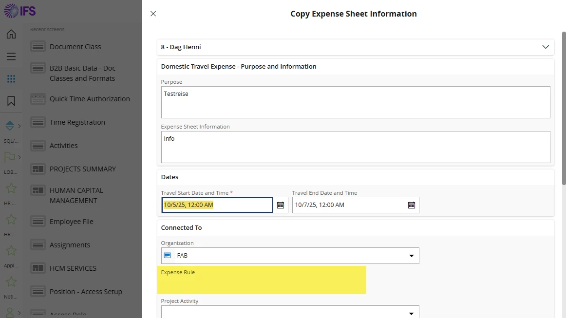 This is from 24R2: When I use the “Copy Expense Sheet” function and change the “from date” on the copy, which is a normal thing to do for a repeating expense claim or travel, the Expense Rule is nulled and I end up with a new travel expense without expense rule! It is not possible to change the expense rule in the copy process.