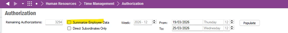 Apps 9 included a toggle on the ‘Authorization’ screen re time authorisation - ‘Summarize Employee Data’ to condense employee lines into 1 where they are linked to more than one position/org code.