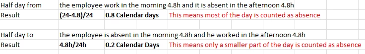 The client need to count their weekends when they book an absence request. So for this I setup the absence calculation & duration to calendar days. I have an issue on half days, the system calculate as 0.8 or 0.2 and not 0.5. Because of this the number of limits is not calculated correctly.