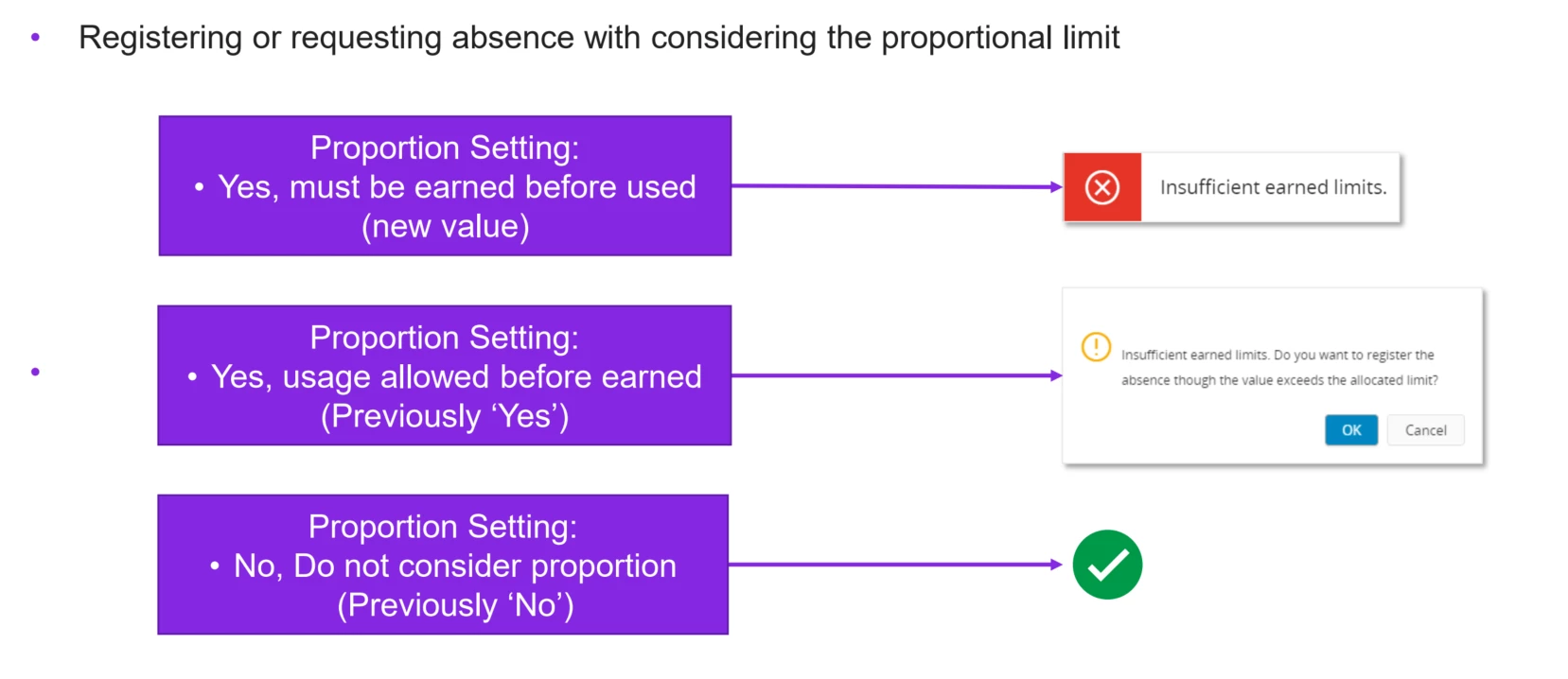 There isn’t any field level help for the Proportion field on the Limit Definition Details screen. It’s in the Limit Settings grouping. We have it set to Yes, Must be earned before used. We’re assuming that within a period, which we’ve defined as 2 weeks that if we’re 1 week into a period that 50% of the period’s allocation will be earned. Then we have the phrase “must be earned before used”, we think this implies that the absence isn’t earned until the employee works that period. In other words, if the employee leaves at the beginning of the 3rd period in December, they will only accrue 2 weeks of the monthly amount and not the full month’s amount.
