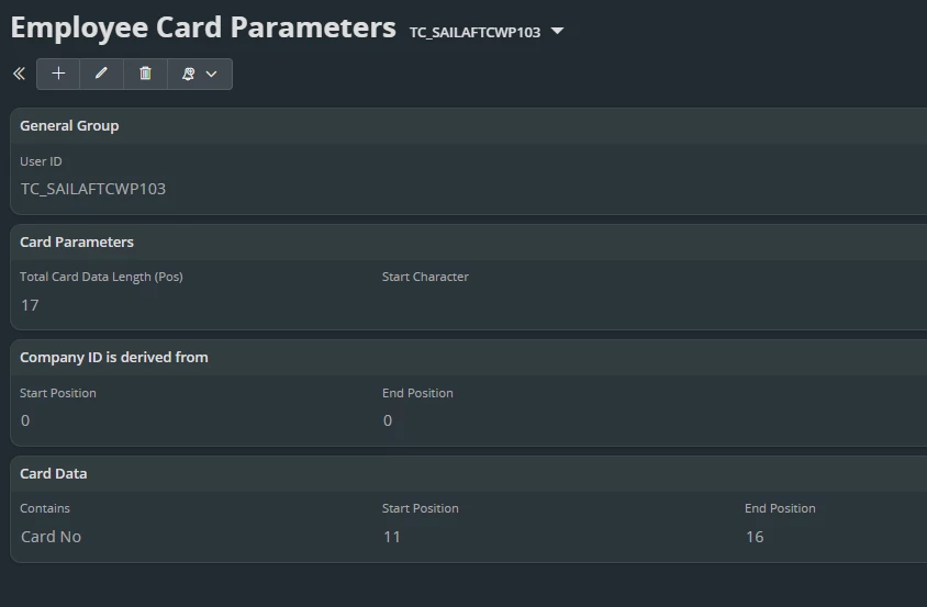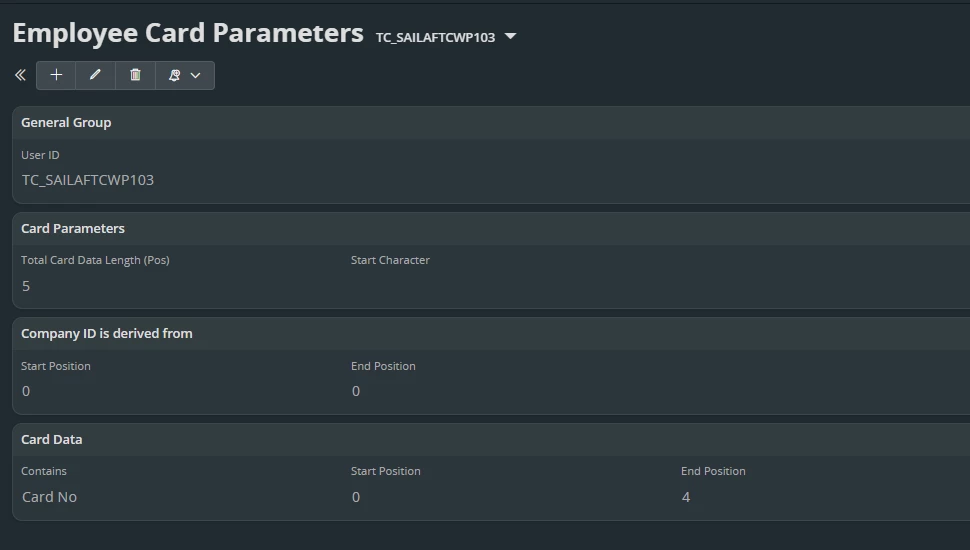 We recently started using new employee badges and the card length is 17 numbers and have been trying to configure our Employee Card Parameters in IFS but are unable to. Our old card length was 5 and this is how we originally have it set up.