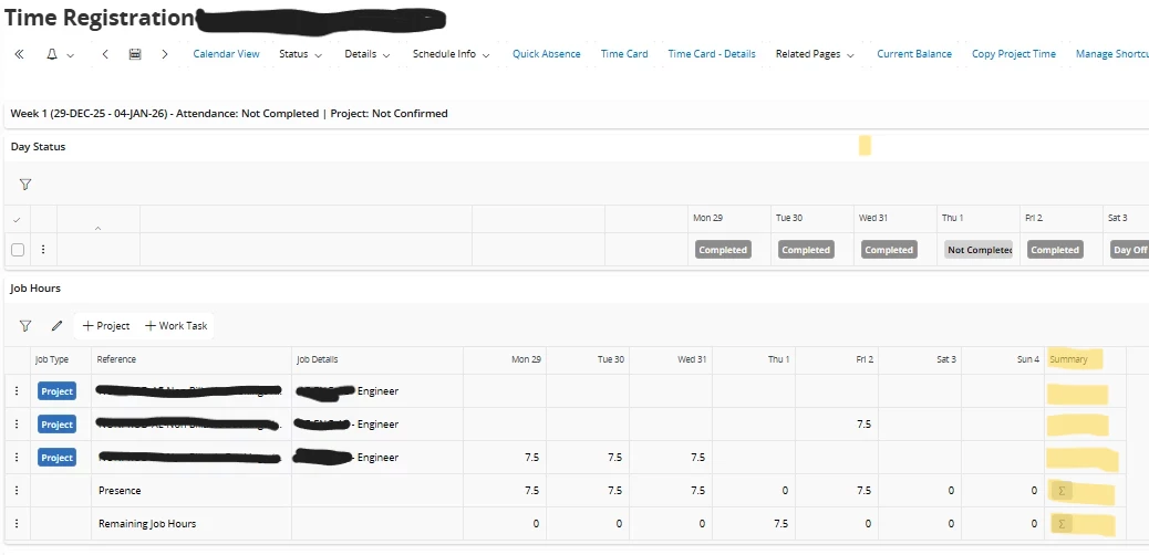 Could someone advise what I should expect the ‘Summary’ Column to show here on Time Registration and/or if there’s some task we need to be running in order for it to be populated?
