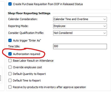 One possibility: Go to Site → Manufacturing → General and, under Shop Floor Reporting Settings in the lower right, verify the Authorization Required option is checked for that site.