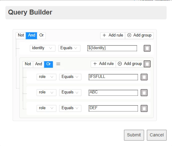 To set the filter, just click on the filter icon and a “Query Builder” modal will pull up. Add your criteria using groups for your AND and OR criteria, then hit submit. Process Variables can be accessed in the filter the same as when using parameters with the ${VariableName} syntax.
