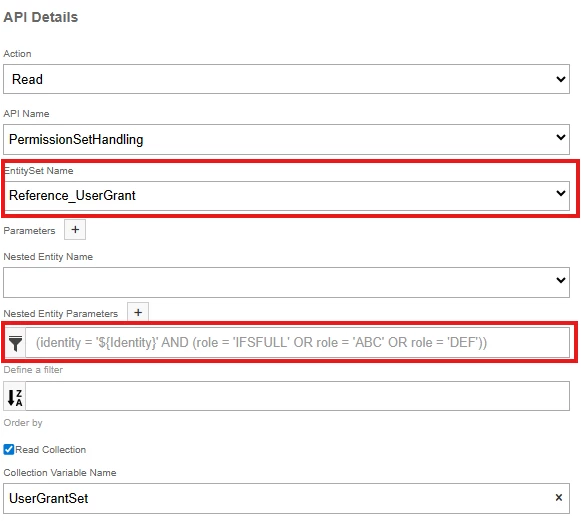 You can use the filter rather than passing key values as parameters, but there are some limitations. You cannot use both parameters and the filter, and in your case the parameters are required since you are using a nested entity. My suggestion would be to change your entity set to Reference_UserGrant, which will then allow you to use the filter: