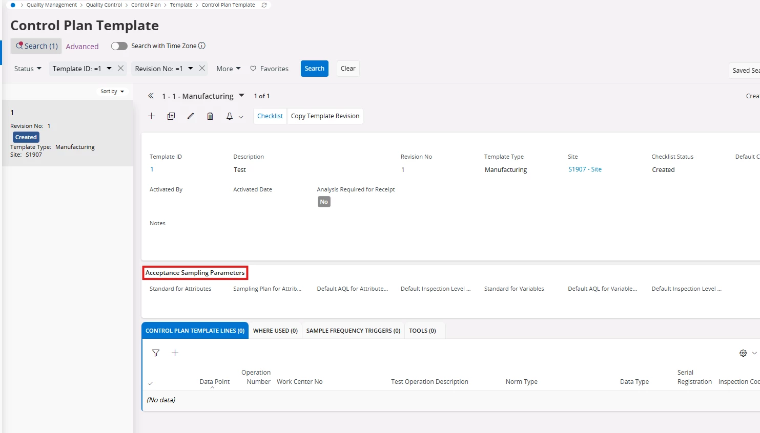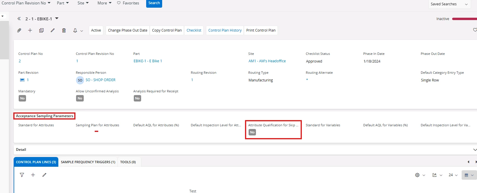 The field “Attribute Qualification for Skip Lot” under Acceptance Sampling Parameters is specific to the actual Control Plan instance, not the template.