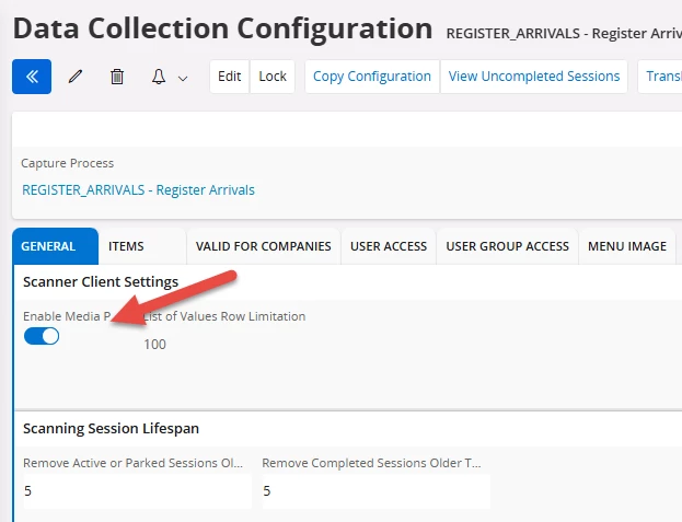 I am using Register arrivals process and set Enable Media pane to enabled. How can I test this functionality from my IFS Zebra scanner? Is there a documentation on this topic? I want to be able take image and upload it.
