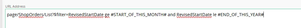 page/ShopOrders/List?$filter=RevisedStartDate ge #START_OF_THIS_MONTH# and RevisedStartDate le #END_OF_THIS_YEAR#   or page/ShopOrders/List?$filter=(RevisedStartDate ge ‘#START_OF_THIS_MONTH#’ and RevisedStartDate le ‘#END_OF_THIS_YEAR#’) , but kept getting and error. Not sure what could be the issue. Thank you very much in advance.
