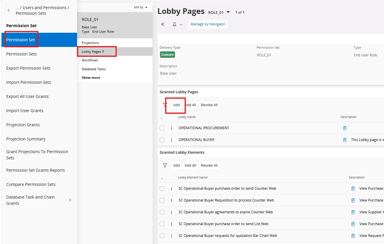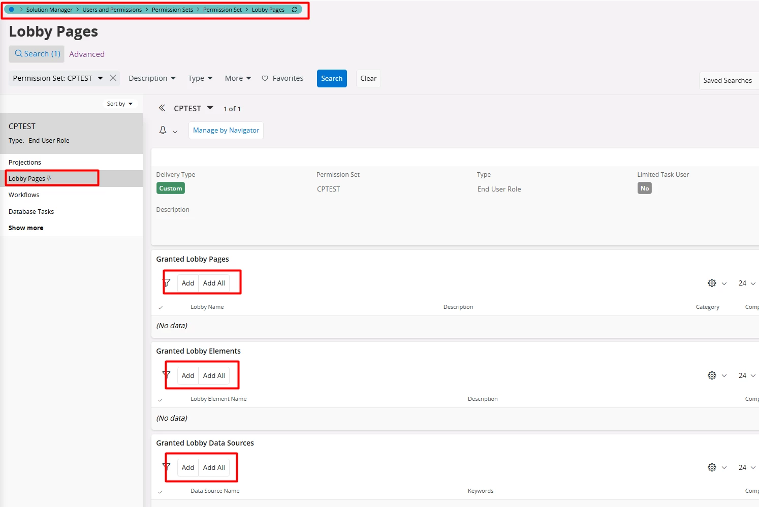 When you open a permission set and navigate to the Lobby Pages section, you’ll see ‘Add’ buttons that allow you to grant access to Lobby Pages, Lobby Elements, and Lobby Data Sources.