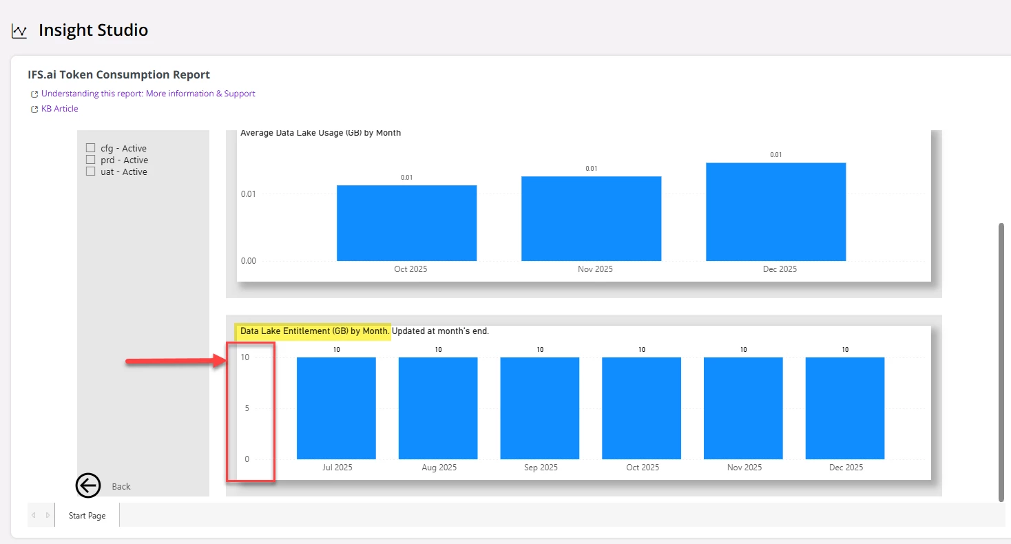 It has to be noted that the 10 GB shown in the IFS.ai Token Consumption Report > Data Lake Entitlement (GB) by Month(as shown in the bard chart with blue bars above) represents the “total Data Lake storage entitlement at the tenant level”. Also note that this is a cumulative storage limit, not a monthly or recurring allocation.