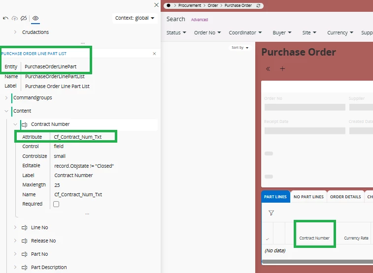In your case, you want the field to display in the purchase order form in the purchase order line part section. If you did want to do this via custom fields which is the simplest and recommended approach,
