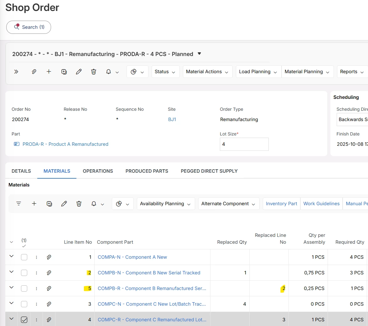 - When I change the material, the new material is set to the last row in SO/materials and that messes up the printed work instructions. replaced material is not in the same place as the original material.
