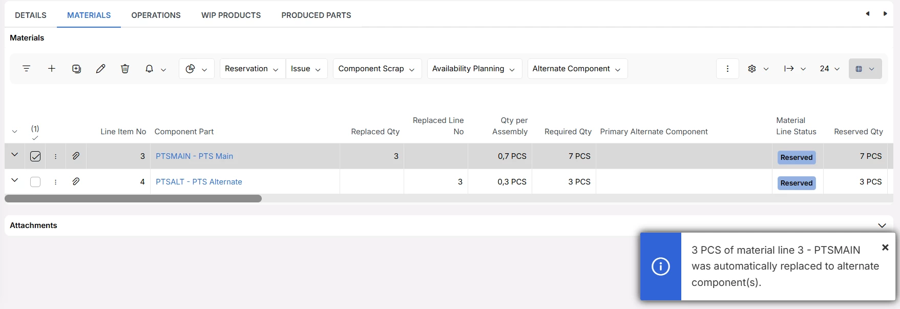 Additionally, I still had to manually reserve the alternate component in the shop order using the Replace Main Component window. I was unable to identify any difference in behavior before and after enabling this toggle, since the same steps were required to process the shop order in both cases.