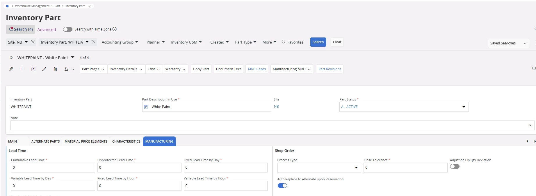 In one scenario, I selected Consume After Main Component and set the stock levels as follows: 4 units for the main part and 3 units for the alternate part. I then created a shop order for a quantity of 5. After running site MRP, the expected result was shown in the Inventory Part Availability Planning screen.