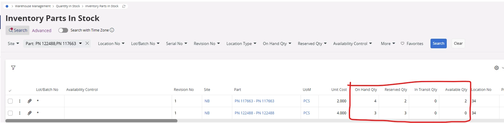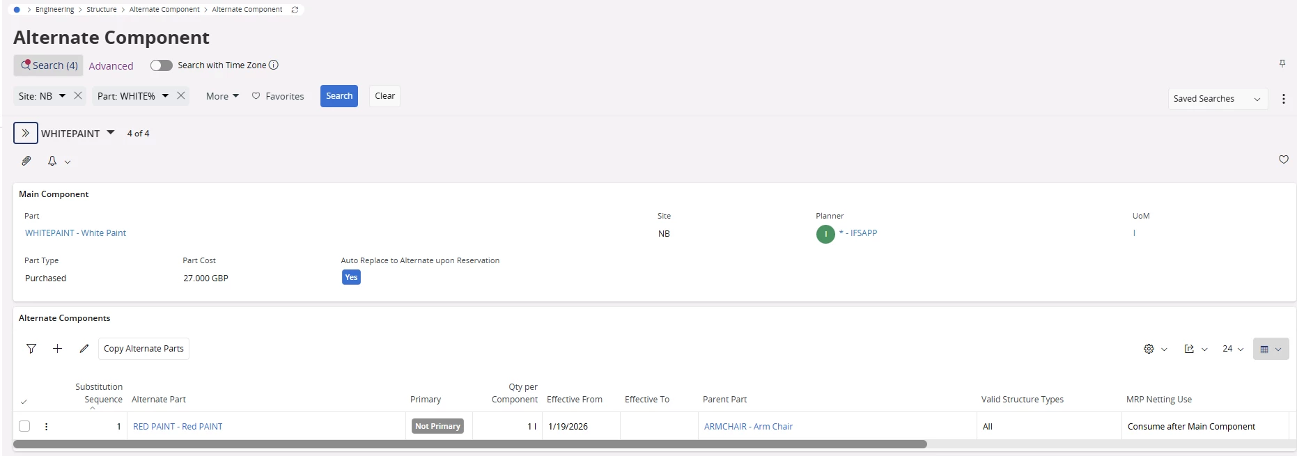 I reviewed the description and created a shop order, then reserved the main component. However, when I checked the Inventory Part Availability Planning screen, I did not observe any change in the quantities or the status of the alternate component.