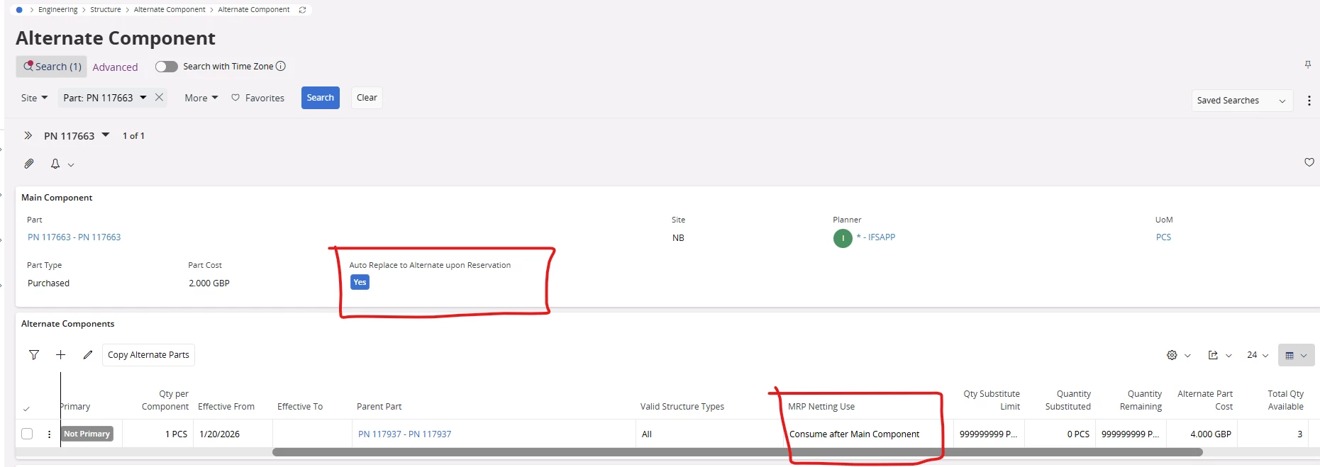 Thank you for the above explanation. However, I have tested the Auto Replace to Alternate upon Reservation toggle with both options available under MRP Netting UseConsume After Main Component and Consume Before Main Component—and observed the same behavior in both cases.