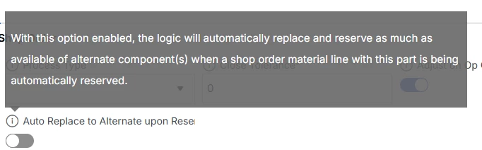 I have enabled this option and confirmed that it is reflected in the Alternate Component. However, after creating Shop Orders and testing multiple scenarios, I’m unable to observe any behavioral difference when the toggle is enabled versus disabled.