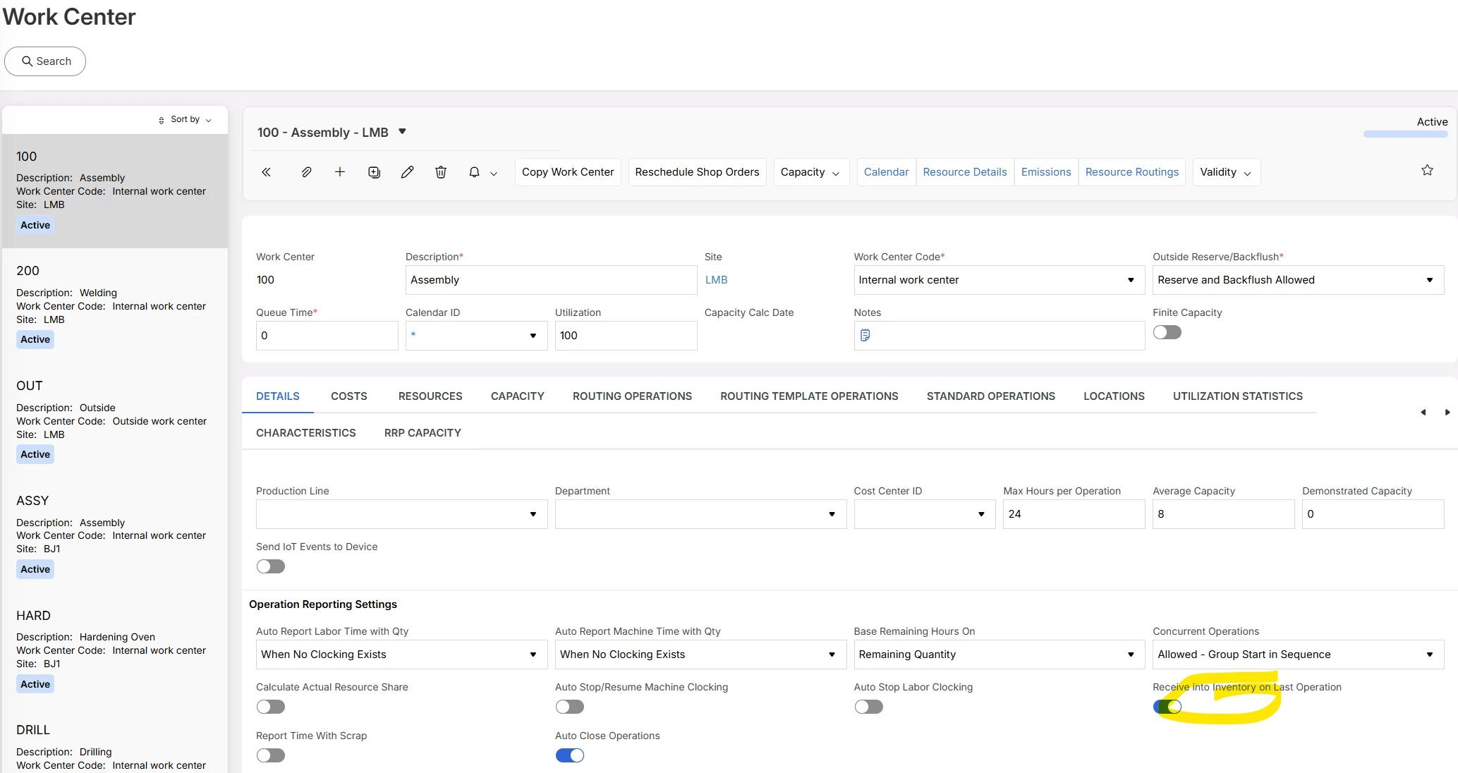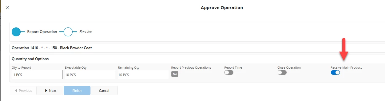 You can control whether to default the toggle to receive the shop order with the last operation from the work center