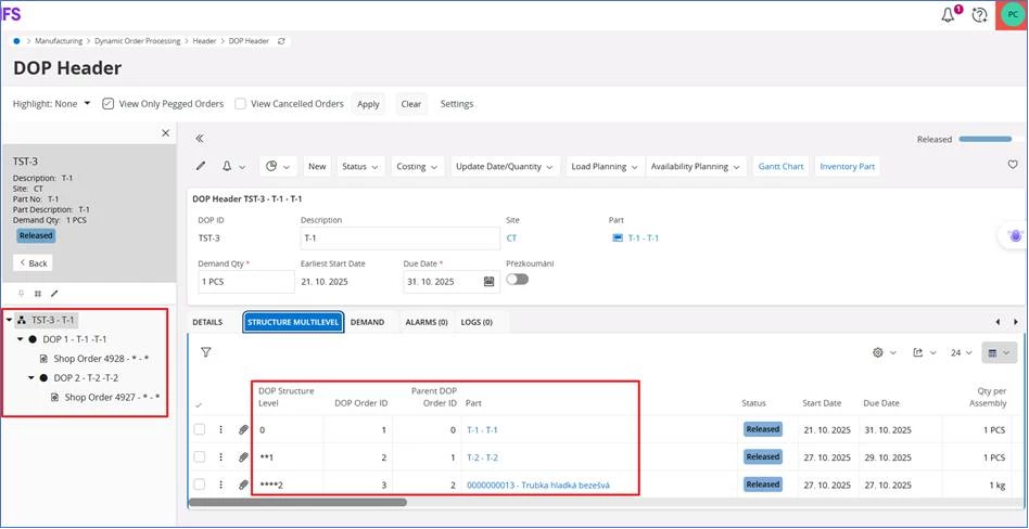 DOP – 3 levels, component T-2 is connected to Operation 20 of T-1.