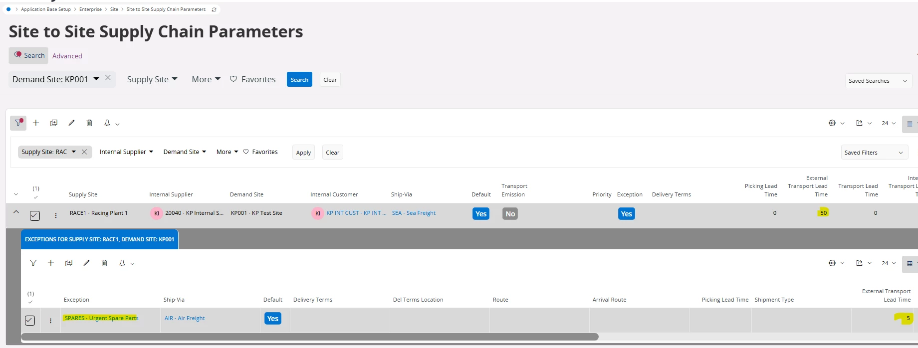 The Exceptions also set up on the Site to Site Supply Chain Parameters page (e.g. I can set a different external transport lead time for parts that will be air freighted)
