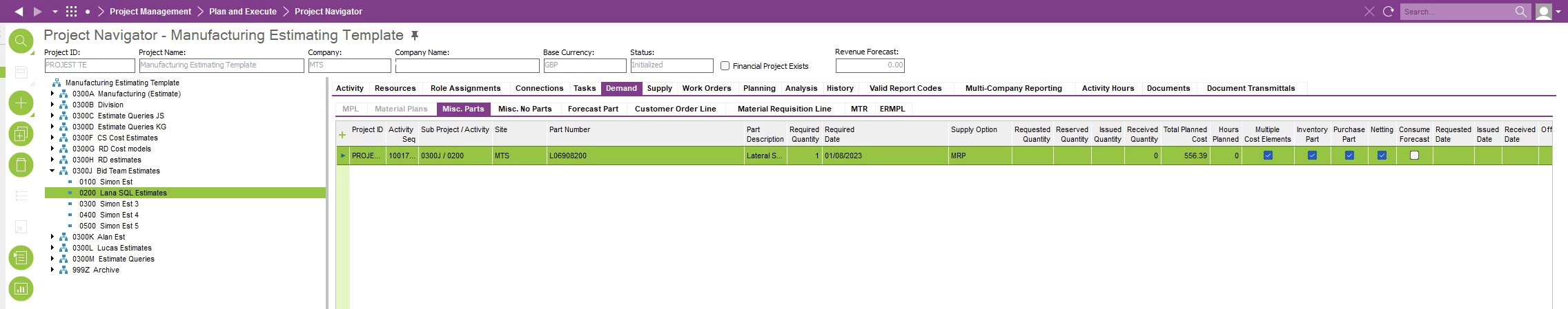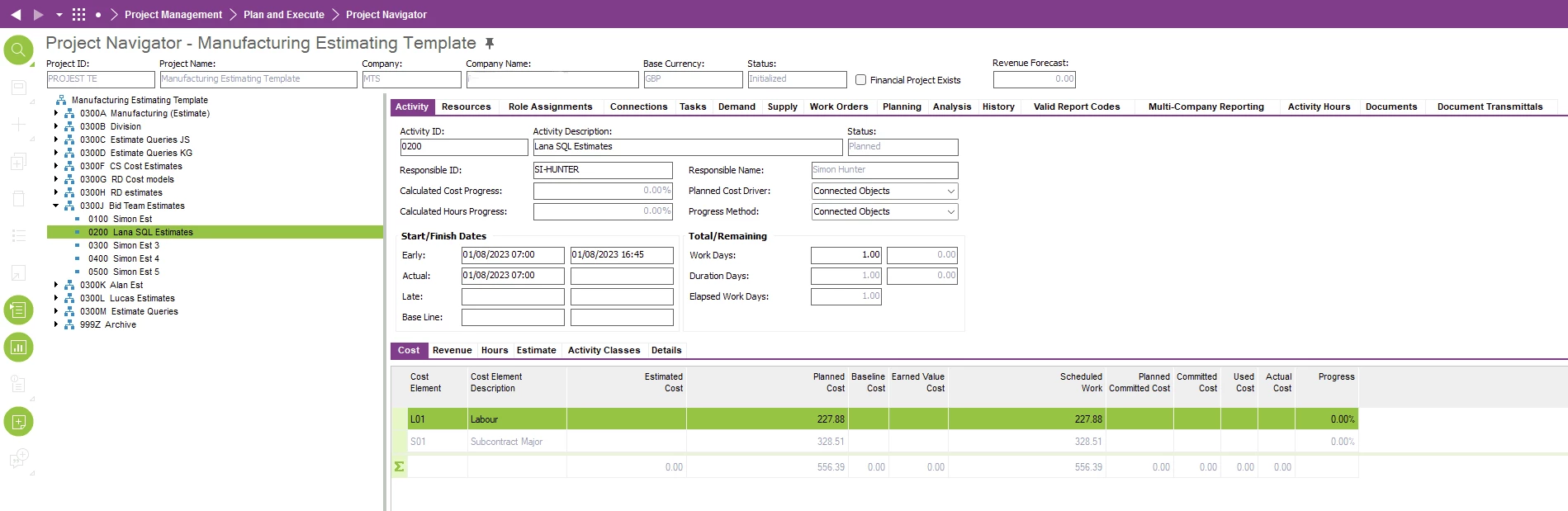 In the Project Navigator, when a line is added in the Demand tab, two lines are automatically created in the Activity -> Cost tab with line IDs L01 and S01.