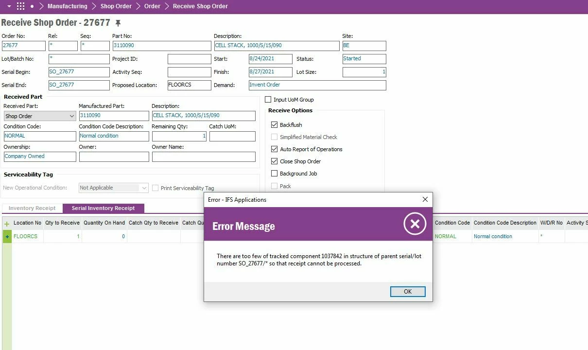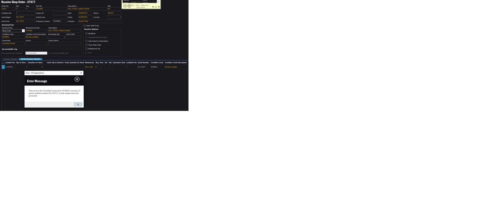 since this part is still in object 3110090-SO_26686, hence the shop order 27677 is failed to build the structure, and cannot be received into stock.