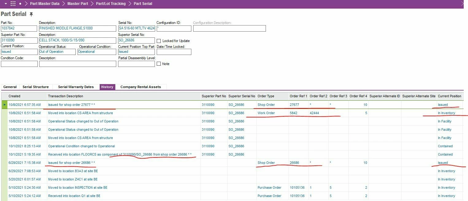 The weird thing is when we open Part Serial window, to track this serial part history. please refer to the attached screen shot.