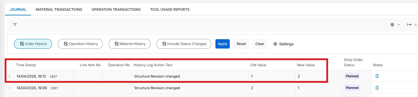 Is there any specific log or history that shows the old and new values for the updated material lines? These updates cannot be found in the shop order history, I can only find the manual changed materials/ routings. Also I dont see the changes records in the background job information.