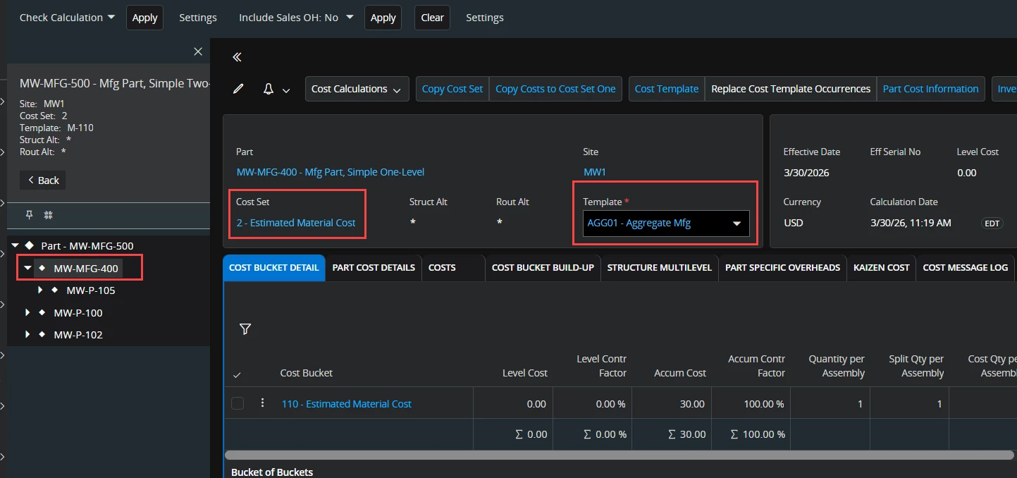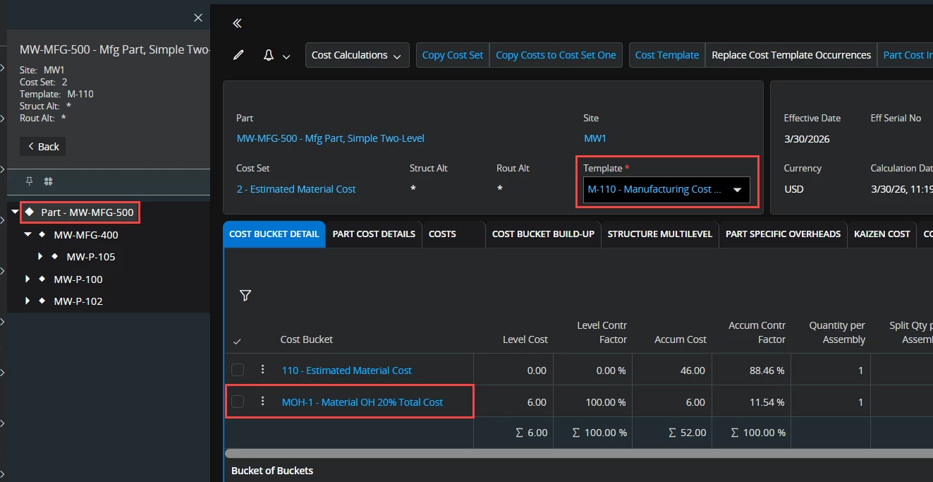 Our overhead generates correctly when the material is issued on the shop order. But we cannot get it to show in the Part Cost. The documentation seems to indicate that it should be possible, but we have tried several combinations with no success so far. Is this possible, and how should the overhead be set up in such a case?