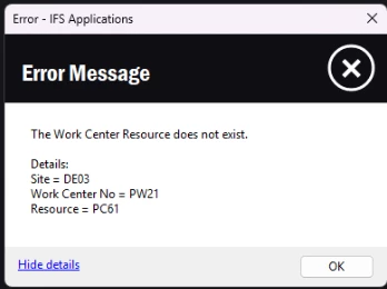 In IFS Apps10 an error occurs when trying to modify Shop Floor Clockings of an operation because the resource assigned to the work center does not exist. IFS displays an error message stating that Resource PW21 does not exist for Work Center PW33. This is correct.