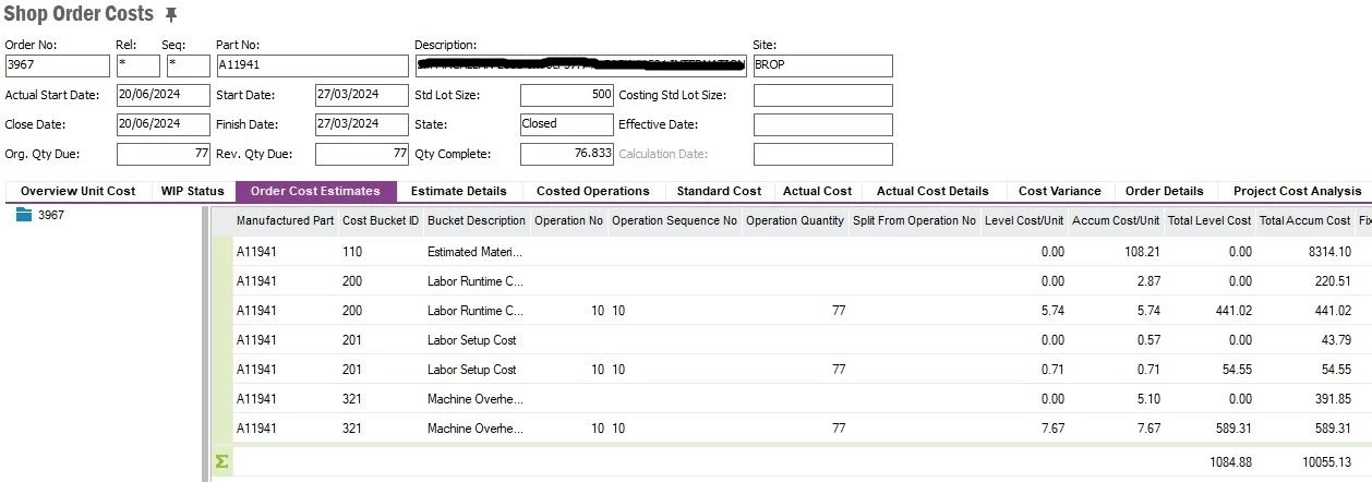 I understand that in some instances the shop order looks at estimated cost, however the Cost Estimate tab from the Shop Order Costs screen shows total costs of £10,055.13 which doesn’t correspond to the inventory value of £9,941.24, so this doesn’t explain this.
