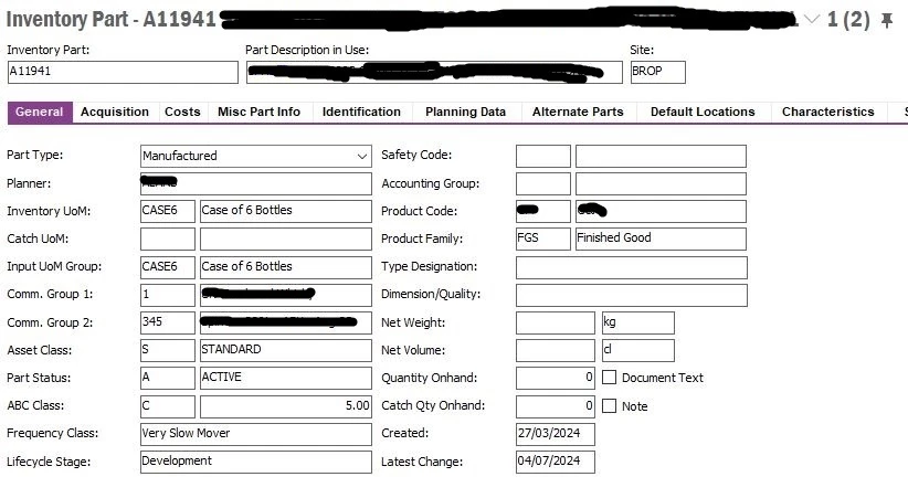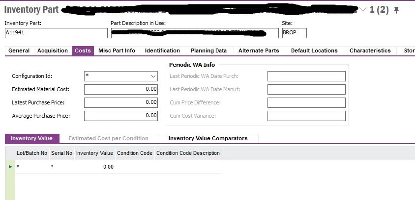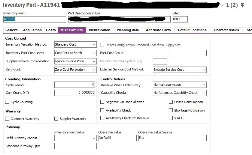 I’ve attached screenshots of the General tab, the Costs tab and the Misc Part Info tab from the Inventory Part screen, as well as the Overview Unit Cost tab and the Cost Estimate tabs from the Shop Order Costs screen.