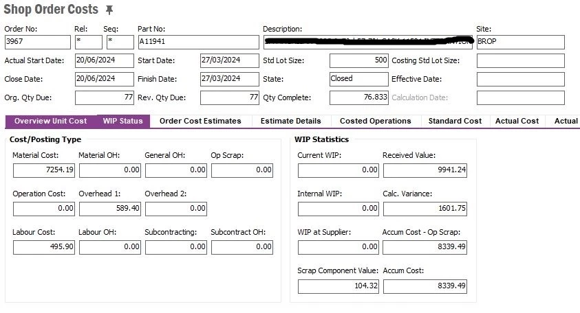 On the Overview Unit Costs tab of the Shop Order Costs screen we understand the Accum Cost figure of £8,339.49 as we can see the detailed breakdown of this under Actual Cost Details, but we don’t understand how the Calc. Variance figure of £1,601.75 is calculated. The product has been booked into inventory at the total value of £9,941.24, so this is impacting on inventory value.